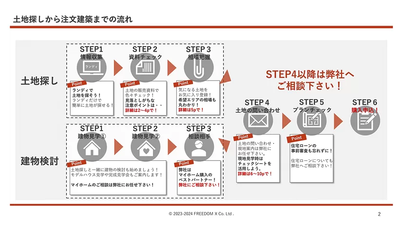 土地探し顧客の土地契約までのリードタイムを縮めるために、接客で使えるシートを「土地探しハンドブック」としてまとめました。 カテゴリごとに分けて使える内容になっているため、接客フェーズに合わせて顧客接点を増やすフックとしてもご活用いただけます。