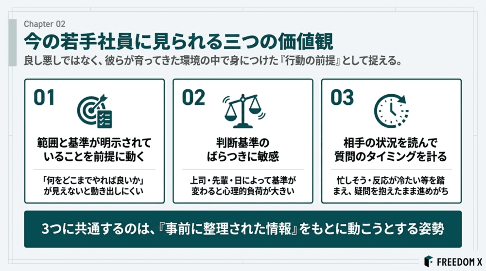これら三つの価値観に共通しているのは、若手社員が「事前に整理された情報」をもとに動こうとする、という点です。