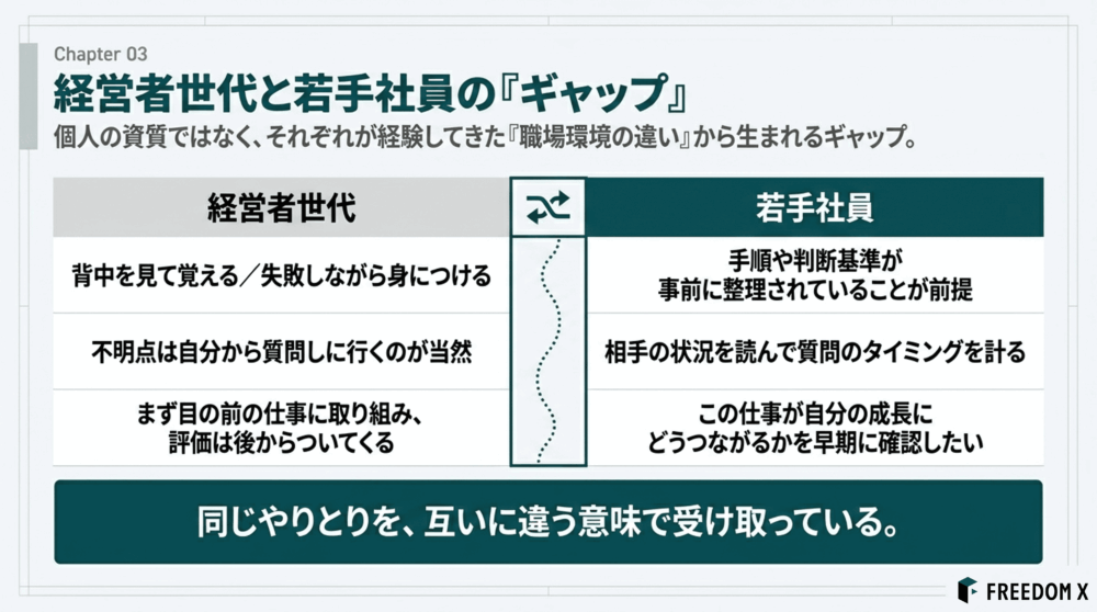 経営側からは「主体性が足りない」と見えても、若手側からは「聞ける状況がない」と感じている、というすれ違いです。